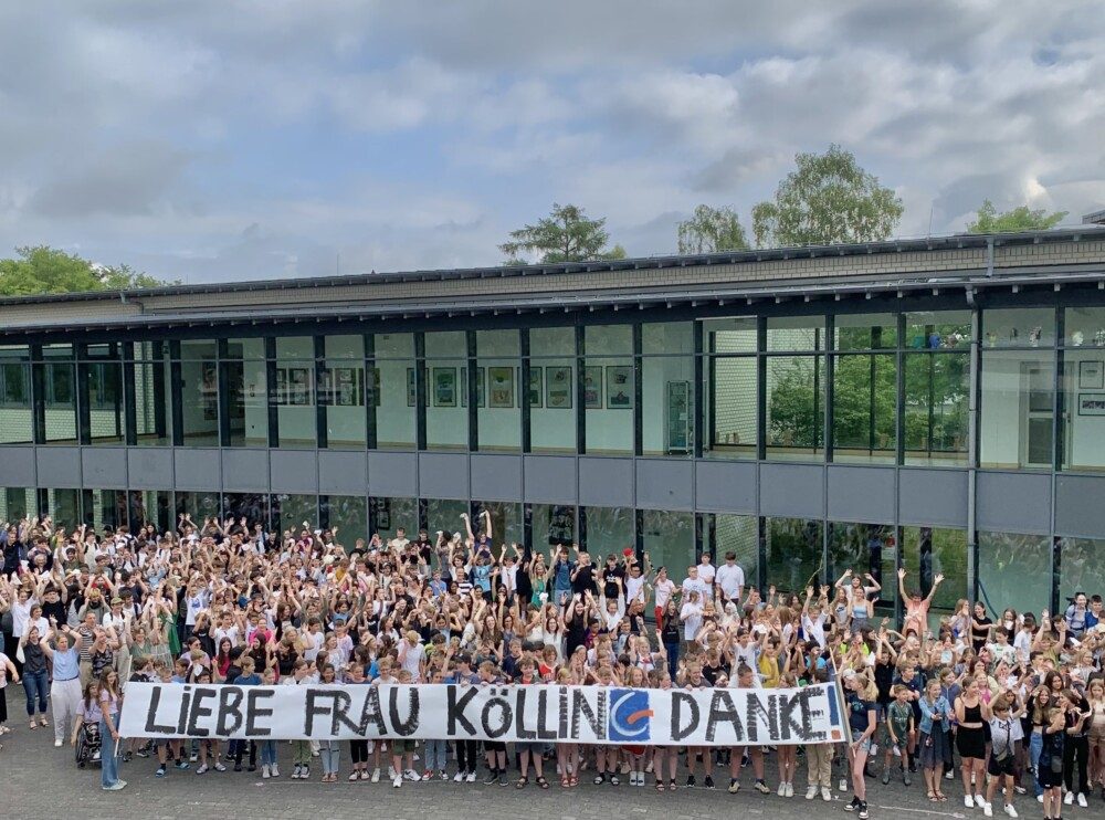 Mit einem dringenden letzten Aufruf bittet das „Bodenpersonal“ die Schulleiterin, zur Gepäckaufgabe zum Boardingschalter auf die Bühne zu kommen. Als Susanne Kölling diese betritt, wird der Beifall laut. Kolleg:innen und Mitarbeiter:innen der Schule, Vertreter:innen der Elternpflegschaft, des Fördervereins und der Schülervertretung sowie Freund:innen und enge Wegbegleiter:innen sind gekommen. Sie alle und der Bürgermeister Hajo Siemes, der Dezernent Herr Rimpler (Schulaufsicht), Herr Weuthen und Frau Schüßler (Schulträger), Roland Virkus (Sportdirektor) und Mirko Sandmöller (Direktor Nachwuchsleistungszentrum) von Borussia Mönchengladbach geben ihr berührende Dankesworte, Beiträge und Geschenke mit auf den Weg.