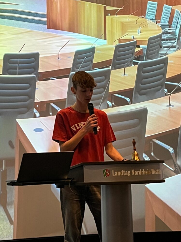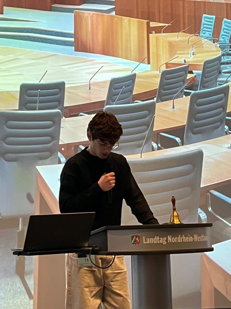 Da der Plenarsaal durch eine Sondersitzung belegt war, startete das Programm in einem Saal mit beeindruckender Panorama-Leinwand und einem Film über die politische Arbeit in NRW. Danach wurde es ernst: In einer simulierten Plenarsitzung zum Thema „Wählen ab Geburt“ übernahmen die Schülerinnen und Schüler die Rollen der Abgeordneten und Fraktionsmitglieder. Ein besonderer Zufall: Ausgerechnet unser Schülersprecher wurde für die Rolle des Landtagspräsidenten ausgewählt und leitete die Sitzung souverän. Die Debatte, für welche der Sowi-LK von Herrn Jansen extra Reden vorbereitet hatte, endete mit einem Konsens: Mit Ausnahme einer einzigen Stimme wurde fast einstimmig gegen das Wahlrecht ab Geburt gestimmt – primär, um die Unabhängigkeit der Wahl vor elterlicher Manipulation zu schützen.