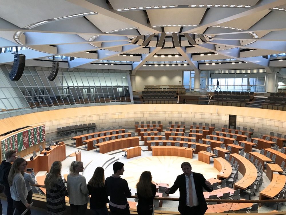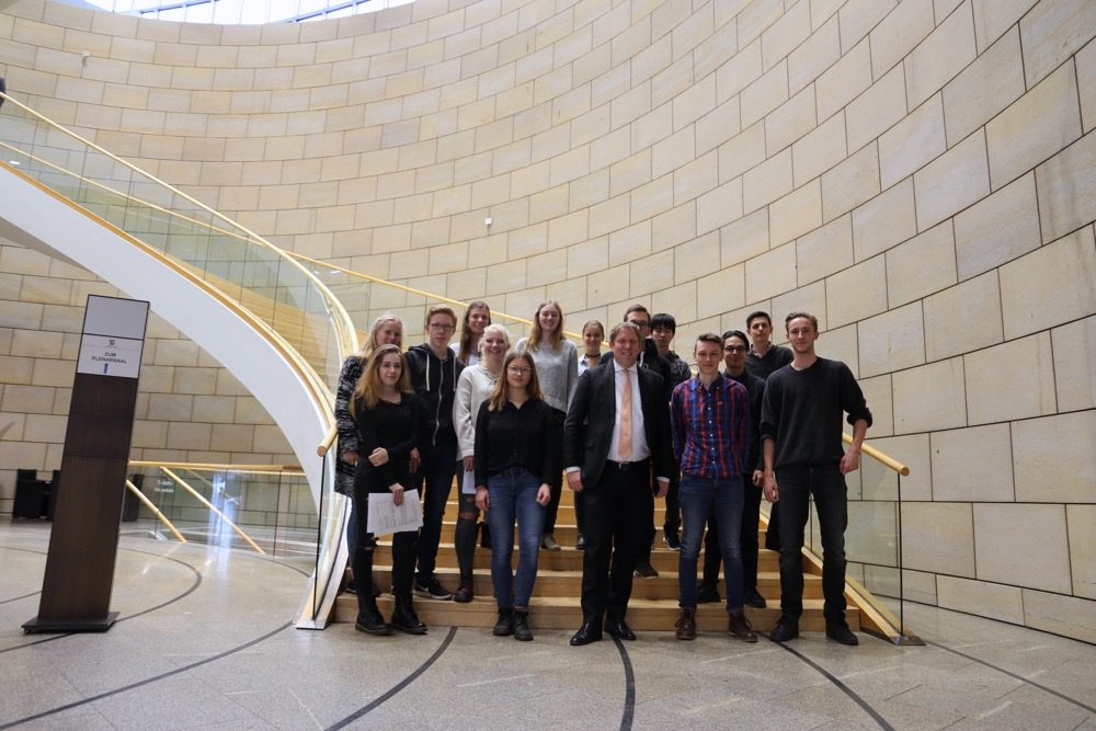 Schülerinnen und Schüler der Q1 folgten am vergangenen Donnerstag der Einladung des Landtagsabgeordneten Jochen Klenner in den Landtag. Sie hatten die Gelegenheit an einer einstündigen „Einführung in die parlamentarische Arbeit“ teilzunehmen und danach die 1. Lesung eines Gesetzentwurfes nachzustellen. Für diese Simulation bereiteten die jungen Besucher ihre Redebeiträge als Fraktionssprecher auf Basis eines Gesetzesentwurfs zum Wahlrecht ab Geburt vor. Als Erasmus Projektteilnehmer war die Schülergruppe natürlich sehr an einem Gespräch mit dem Landtagsabgeordneten Jochen Klenner interessiert. Das diesjährige Projektthema „Creating & developing your future“ gab genügend Anlass zu Fragestellungen hinsichtlich der Bildungspolitik. Mit einem Interview mischten sich die Redakteure des Schülermagazins standpunkt und der Schülersprecher in die aktuelle Debatte der Schulpolitik in Mönchengladbach ein. Nachzulesen auf standpunktonline.com