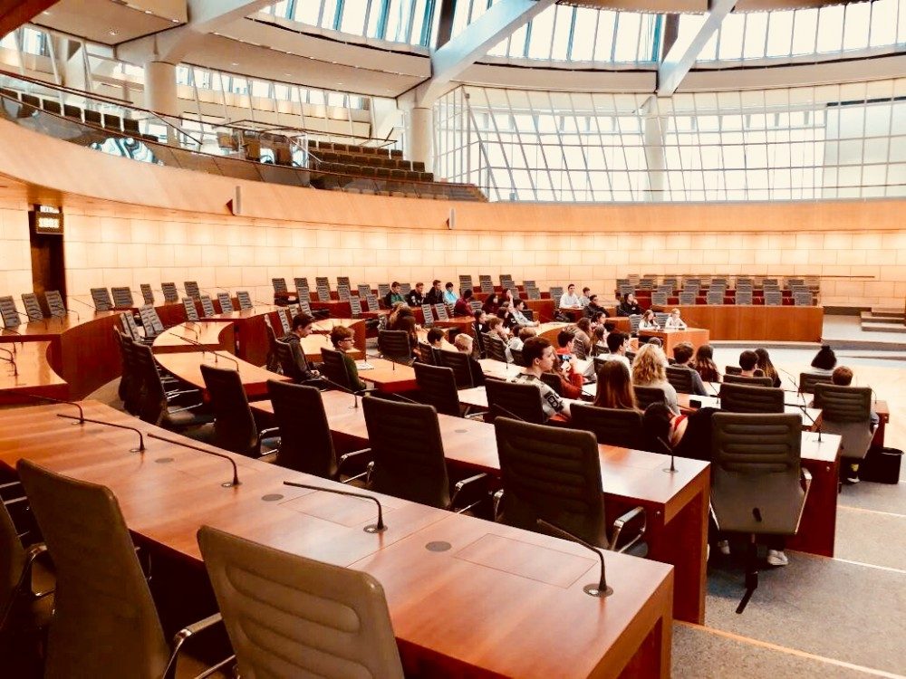 Nach einem ausgiebigen Frühstück in der Kantine des Landtages begann das Schülerprogramm des Landtages Düsseldorf. Im Plenarsaal durften sie, vom Podium aus, ihre Meinungen zu einem Gesetzentwurf zu einem im GL-Unterricht vorab erarbeiteten Themas äußern.