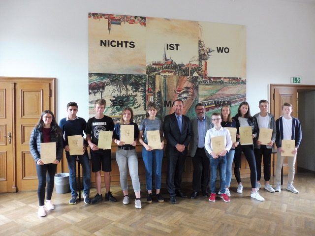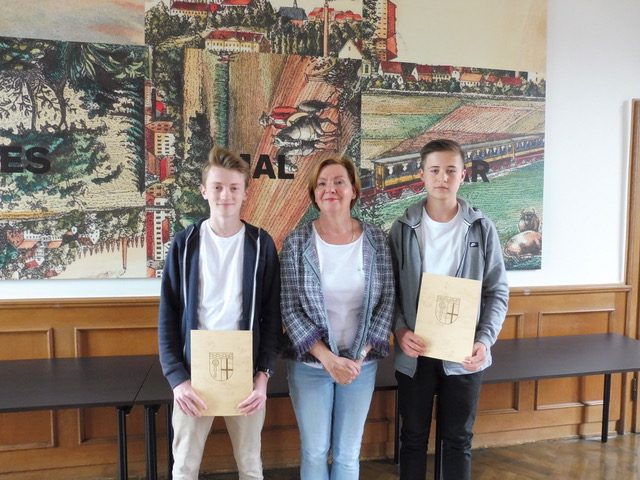 Beim diesjährigen Fremdsprachenwettbewerb im Fach Französisch der Schulen in Mönchengladbach erzielten die Schüler Vincent Jansen und Fabian Dreyer (beide Klasse 10.2) einen respektablen fünften Platz. Die Prüfungen bestanden aus einem schriftlichen und einem mündlichen Teil. Für ihre Leistungen erhielten sie im Rathaus vom Bürgermeister Ulrich Elsen im Rahmen einer kleinen Feierstunde ein Buchgeschenk. Begleitet wurden sie hierbei von ihrer Französischlehrerin Andrea Witte.