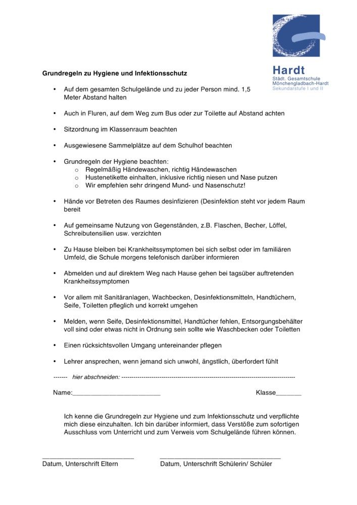 Wir erwarten von allen, die in die Schule kommen, eine ausnahmslose Disziplin hinsichtlich der bekannten Hygieneregeln. Sie werden den Schülerinnen und Schülern am Donnerstag zur Unterschrift ausgehändigt. Bitte dokumentieren Sie als Erziehungsberechtigte der noch nicht volljährigen Schülerinnen und Schüler Ihre Kenntnisnahme durch Ihre Unterschrift.