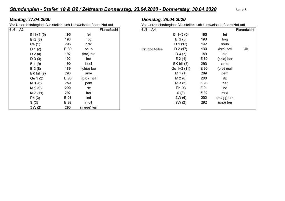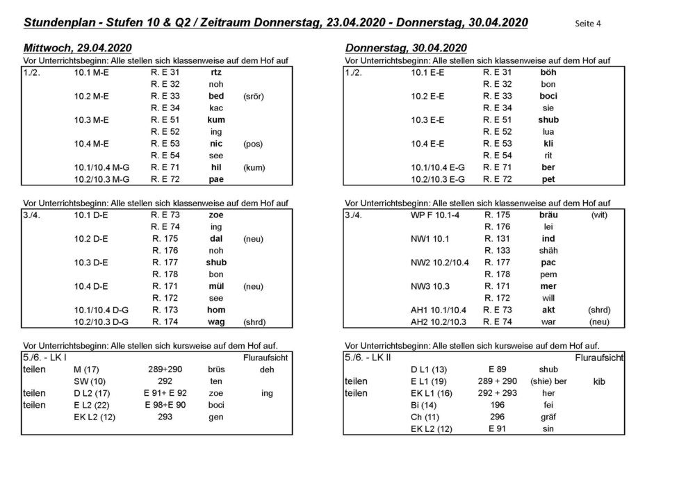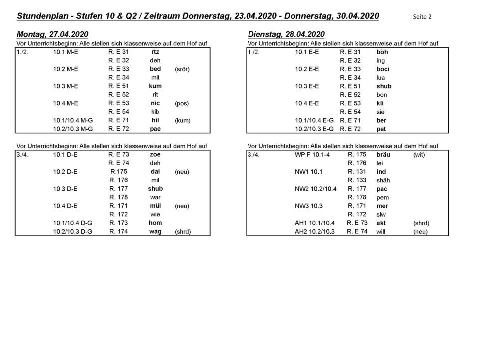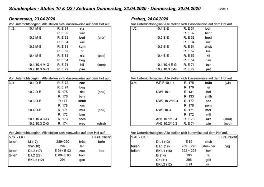 Die Lernangebote erfolgen in Gruppen mit maximal 15 Schülerinnen und Schülern, die meisten Lerngruppen sind kleiner. Dem Plan können Sie und Ihre Kinder entnehmen, bei wem welches Lernangebot stattfindet. Dass dies nicht immer bei dem „eigenen“ Lehrer oder der „eigenen“ Lehrerin stattfinden kann, ist der Zugehörigkeit einiger Lehrkräfte zur Risikogruppe geschuldet. Es sind aber jeweils genügend Fachlehrkräfte mit an Bord. Die zentralen Prüfungen 10 werden in diesem Jahr übrigens nicht zentral gestellt, sondern die aktuellen Fachlehrer und Fachlehrerinnen erstellen sie selber. Sie orientieren sich dabei an den Vorgaben und am erteilten Unterricht. Es bleibt bei den Terminen 12., 14. (irrtümlich stand hier der 13. Mai) und 19. Mai 2020.