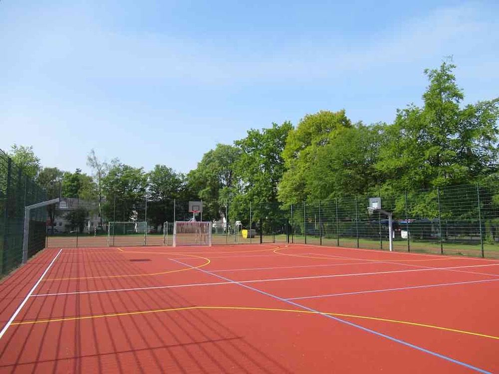 Voller Sehnsucht werden die Schülerinnen und Schüler auf das neue Multifunktionsspielfeld, den ehemaligen „Gummiplatz“ am Vossenbäumchen, schauen, denn noch regieren die Hygienebestimmungen das Schulleben und diese sehen Sportaktivitäten mit möglichem Körperkontakt nicht vor. Aber alle – Lehrkräfte und Schülerinnen und Schüler – freuen sich schon auf die „Zeit danach“ und die neue Spielfläche mit einem perfekten Belag, der auch bei schlechtem Wetter bespielbar ist. Mit der Linierung für Volleyball, Handball, Basketball und Fußball sind die vier wichtigsten Mannschaftsspiele möglich, und dies nicht nur in den Pausen, sondern auch im Sportunterricht! Also: Große Vorfreude in der Gesamtschule Hardt NRW Sportschule.