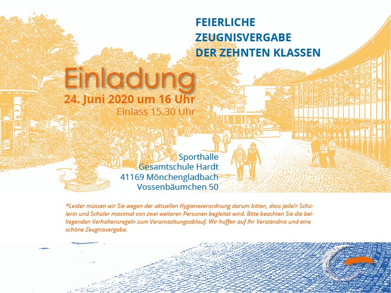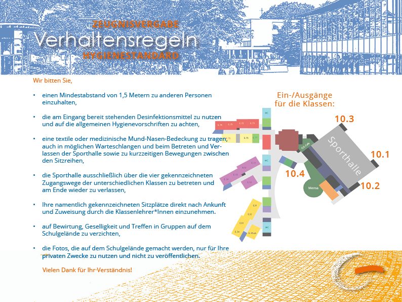 Dem Virus zum Trotz können sich die Schüler/innen der Stufe 10 über ihre Zeugnisse freuen. Auf die feierliche Entlassfeier, wo sich der Jahrgang eigentlich mit dem Motto „Die goldenen 20er“ verabschieden wollte, muss in diesem Jahr allerdings verzichtet werden. Stattdessen laden wir die Schülerinnen und Schüler mit jeweils zwei Begleitpersonen zur feierlichen Zeugnisvergabe am 24. Juni um 16 Uhr mit viel körperlichem Abstand in die Sporthalle ein.