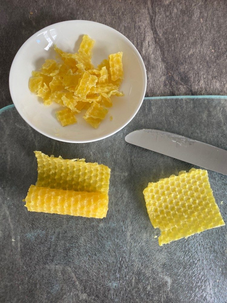 Wichtig: Wenn du Bienenwachsplatten oder -stücke hast, müssen sie mit einer Reibe oder einem Messer in kleine Stücke zerkleinert werden. Bienenwachspastillen kannst du hingegen verwenden, ohne sie zu zerkleinern.