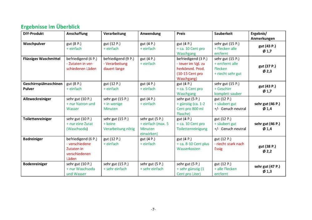 Die Tabelle auf Seite 7 zeigt, dass alle DIY-Produkte gut bis sehr gut abschneiden, was bei genauerer Betrachtung allerdings etwas überrascht, da der Erwerb der Zutaten sowie deren Verarbeitung häufig als schwierig und zeitaufwändig eingeschätzt werden. Der Test zeigt jedoch, dass die nachhaltigen Produkte nicht nur im Punkt Sauberkeit überzeugen, sondern auch häufig leicht zu erwerben und zu verarbeiten sind und nur geringe Kosten aufweisen.